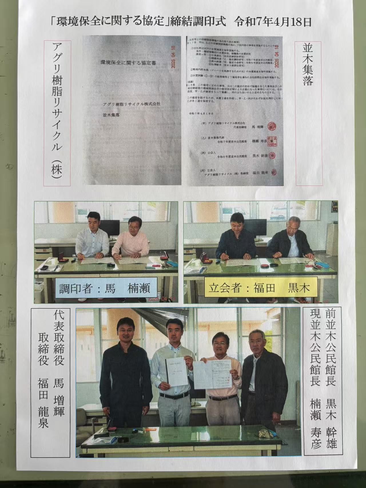 アグリ樹脂リサイクル株式会社は、地域社会との連携を深め、環境保全活動を推進するため、令和7年4月18日に並木集落との間で「環境保全に関する協定」を締結しました。